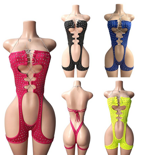 Royal Rhinestone Deep-V Monokini Bodysuit – Sparkle Halter Thong One-Piece